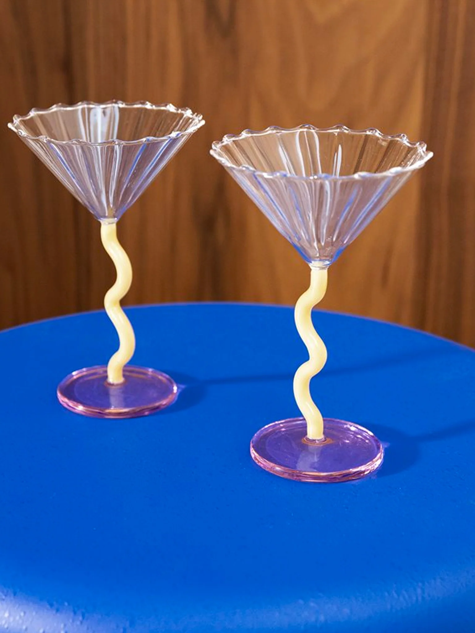 The stunning look of this set of 2 curved caramel coupe glasses makes them suitable for any special occasion. The coupes are formed from delicate glass, with the coloured glass and subtle shape combination giving them a unique look. These impressive coupes can be used for champagne, water and other drinks, as well as for ice cream and desserts.